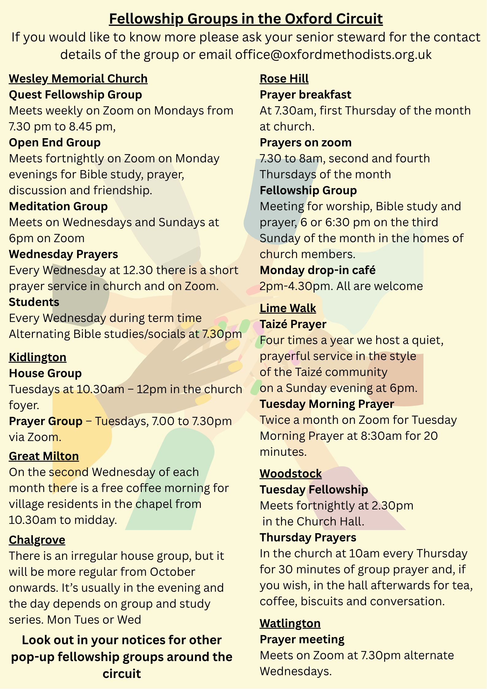 If you would like to know more about one of the groups, please ask your Senior Steward for the contact details of the organiser or email office@oxfordmethodists.org.uk.